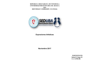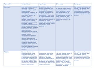 Este documento describe diferentes tipos de artes, incluyendo artes escénicas, plásticas, visuales, audiovisuales y digitales. Explica las características y semejanzas de cada tipo de arte, como que son expresiones artísticas que motivan a las personas y permiten que los artistas demuestren sentimientos. Además, destaca la importancia de las artes para el desarrollo personal y la sociedad.