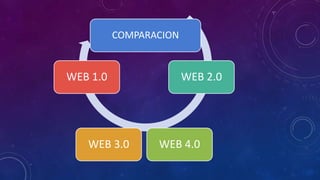 El documento compara las características de la Web 1.0, 2.0, 3.0 y 4.0. La Web 1.0 consistía en páginas estáticas con contenido que no podía actualizarse. La Web 2.0 permitió mayor colaboración entre usuarios a través de redes sociales y mensajería. La Web 3.0 se caracteriza por su inteligencia y capacidad de distribuir información de manera semántica a través de múltiples servidores. Finalmente, la Web 4.0 pretende ser tan potente como el cerebro humano a