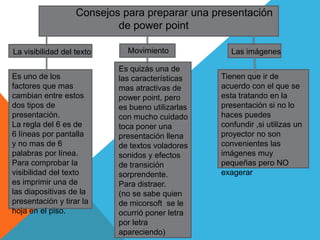 Este documento ofrece consejos para preparar una presentación de PowerPoint, incluyendo mantener el texto visible siguiendo la regla de 6, usar movimiento con moderación para no distraer, y asegurarse que las imágenes sean del tamaño adecuado y estén relacionadas con el tema tratado.