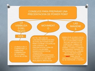 Este documento ofrece consejos para preparar una presentación de PowerPoint efectiva. Recomienda seguir la regla de los 6 para el texto, comprobar la visibilidad y combinar colores y tipos de letra adecuados. También sugiere usar imágenes y movimiento con cuidado y de acuerdo al tema para no distraer a la audiencia ni causar confusión.