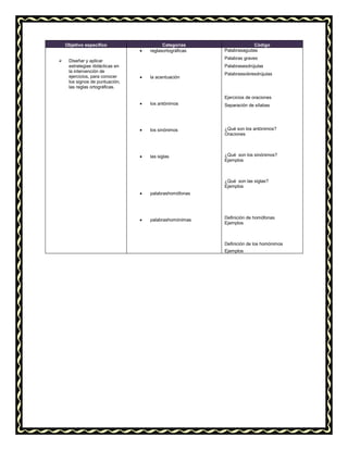 Este documento presenta un cuadro de categorías para diseñar estrategias didácticas y proyectos que promuevan el aprendizaje de los estudiantes. El cuadro incluye seis proyectos sobre temas como el artículo, los cuentos latinoamericanos, los derechos humanos, la mesa redonda, y cómo hablar; y objetivos específicos como conocer signos de puntuación y reglas ortográficas a través de ejercicios. Cada proyecto contiene un índice, propósitos, apre
