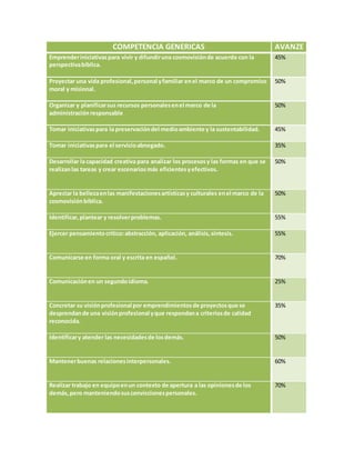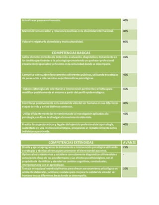 Este documento presenta una lista de competencias genéricas, básicas y extendidas para un programa de psicología. Algunas de las competencias clave incluyen proyectar una vida profesional y familiar de acuerdo con principios éticos, identificar y resolver problemas, comunicarse efectivamente, y aplicar métodos éticos y legales en el tratamiento psicológico para promover el bienestar de los pacientes.