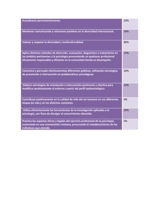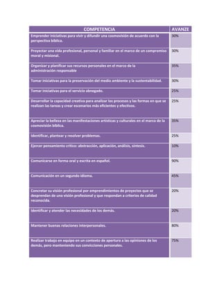 Este documento presenta una lista de competencias con porcentajes asociados. Algunas de las competencias principales incluyen proyectar una vida profesional y familiar de acuerdo con principios morales y misionales (30%), organizar recursos personales de manera responsable (35%), desarrollar la capacidad creativa para analizar procesos y tareas (25%), y comunicarse de forma oral y escrita en español (90%).