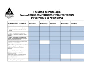 Este documento presenta el perfil profesional y las competencias generales evaluadas en el tercer portafolio de aprendizaje de la Facultad de Psicología. Identifica cinco competencias académicas, profesionales, personales, eclesiásticas y artísticas, incluyendo emprender iniciativas de acuerdo a una perspectiva bíblica, desarrollar la creatividad y proyectos de investigación, concretar una visión profesional a través de proyectos de calidad, y mantener comunicación y relaciones positivas