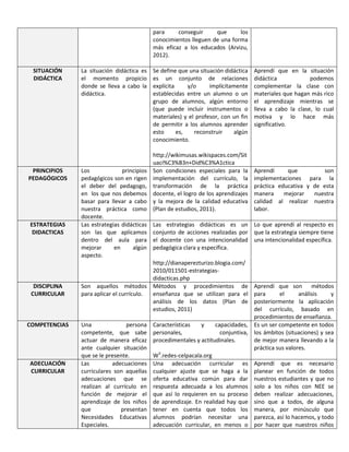 El documento presenta definiciones de varios términos clave relacionados con la educación como currículo, cultura, plan de estudios, programas, didáctica, situación didáctica, principios pedagógicos, estrategias didácticas, disciplina curricular, competencias, adecuación curricular y evaluación. La estudiante Ana Karen León Cázarez aprendió que estos términos son fundamentales para entender los procesos educativos y mejorar su práctica docente.