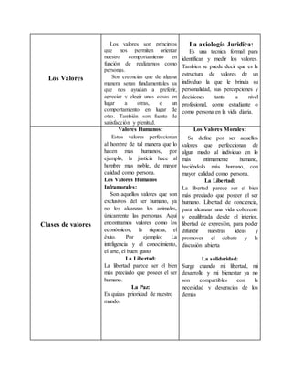 Este documento resume los principales conceptos de ética y valores. Define valores como principios que guían el comportamiento humano. Explica que la ética estudia lo moral y cómo justificar sistemas morales. Distingue entre valores humanos, morales e inframorales. Finalmente, contrasta la ética con la moral, señalando que la ética es una reflexión teórica sobre normas morales establecidas socialmente.