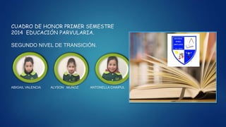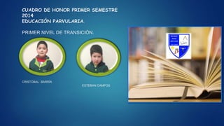 Este documento presenta los resultados académicos del primer semestre de 2014 para los diferentes niveles educativos de una escuela, incluyendo los estudiantes con el mejor rendimiento académico y asistencia en cada curso. Se destacan los nombres de los tres mejores estudiantes de cada curso en rendimiento y asistencia.