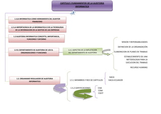 Este capítulo introduce los fundamentos de la auditoría informática. Explica el rol de la tecnología en la gestión empresarial y la importancia de la auditoría informática para evaluar los sistemas de información y tecnología. También describe las funciones de un departamento de auditoría informática dentro de una organización, incluyendo la elaboración de planes de trabajo y el establecimiento de una metodología para realizar auditorías. Por último, presenta a ISACA como un organismo regulador clave de la auditoría informática a nivel internacional.