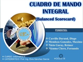 El documento presenta el Cuadro de Mando Integral (CMI), un sistema de gestión estratégica que permite medir el desempeño de una empresa desde cuatro perspectivas clave: financiera, cliente, procesos internos y aprendizaje y crecimiento. Explica que el CMI ayuda a las empresas a alinear sus objetivos y acciones con su estrategia mediante indicadores. También describe los pasos para construir un CMI, que incluyen definir la visión y misión, analizar factores internos y externos, establecer objetivos estraté