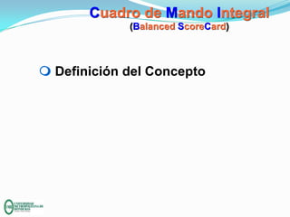 El Cuadro de Mando Integral (Balanced Scorecard) es una herramienta de gestión que alinea la estrategia y los objetivos organizacionales con los resultados, apoyando un enfoque en el futuro más que en la medición histórica. Compuesto por varias perspectivas (financiera, de clientes, de procesos internos y de aprendizaje), requiere la participación activa de toda la plantilla y la revisión continua de indicadores. Su objetivo es mejorar la satisfacción del cliente y optimizar el uso de recursos en la organización.
