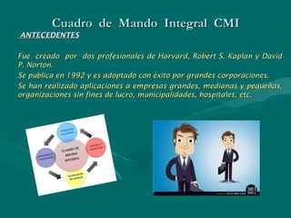 Este documento presenta una introducción al Cuadro de Mando Integral (CMI). Explica que fue creado por dos profesionales de Harvard en 1992 y ha sido adoptado con éxito por grandes corporaciones. Define el CMI como una herramienta que ayuda a traducir la estrategia de una empresa en objetivos operativos medibles a través de indicadores, permitiendo gestionar la estrategia a corto y largo plazo. Finalmente, describe brevemente las cuatro perspectivas del CMI: financiera, clientes, procesos internos y aprendiz