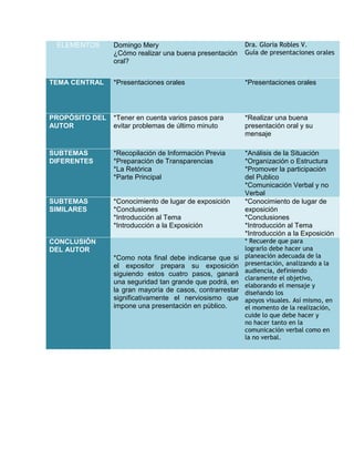 El documento presenta consejos para realizar una buena presentación oral, discutiendo elementos como la recopilación de información previa, la preparación de transparencias, la introducción al tema y las conclusiones. Ofrece recomendaciones sobre el análisis de la audiencia, la definición del objetivo, el diseño del mensaje y los apoyos visuales para lograr una presentación efectiva.