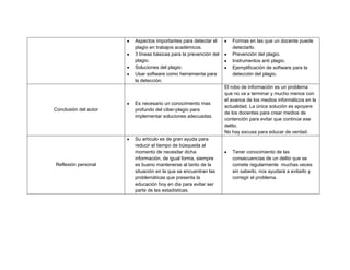 El documento analiza el plagio académico en la era digital. Explica que el uso cada vez más común de internet y las tecnologías digitales ha facilitado el plagio de información, especialmente entre estudiantes universitarios. Se discuten las investigaciones más recientes sobre las causas y formas del plagio académico, así como métodos para detectarlo y prevenirlo, incluyendo el uso de software antiplagio. El autor concluye que se necesita una mejor comprensión del ciberplagio para implementar soluciones efectivas a este problema creciente.