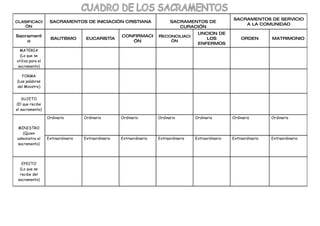 Este documento clasifica los siete sacramentos de la Iglesia Católica en dos grupos: los sacramentos de iniciación cristiana (Bautismo, Confirmación y Eucaristía) y los sacramentos de curación y servicio a la comunidad (Reconciliación, Unción de los enfermos, Orden y Matrimonio). Para cada sacramento se especifica su materia, forma, sujeto que lo recibe y ministro que lo administra.