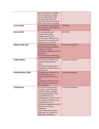 El resumen describe los diferentes elementos de una red, incluyendo cables de red, terminales RJ-45, switches, tarjetas de red inalámbricas, adaptadores USB y PCMCIA, puntos de acceso, routers wifi, módems ADSL, cable modems, modem-routers ADSL y routers por cable, y especifica si cada elemento se usa para redes Ethernet, wifi o para conexión a Internet.