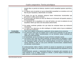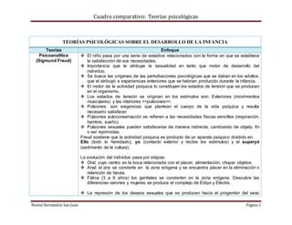Este documento presenta un cuadro comparativo de varias teorías psicológicas sobre el desarrollo de la infancia. Brevemente describe las teorías psicoanalítica de Freud, conductista de Watson, gestalt de Wertheimer y Köhler, cognitiva de Piaget, y sociocultural de Vygotsky, enfocándose en sus perspectivas sobre el aprendizaje, la motivación de la conducta, y la influencia del ambiente social y cultural en el desarrollo infantil.