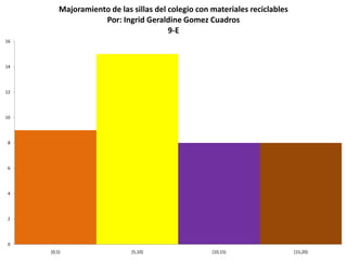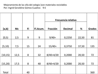 Este documento describe un proyecto para mejorar las sillas del colegio utilizando materiales reciclables. Presenta una tabla con la frecuencia relativa de sillas en diferentes rangos de grados de desgaste, así como un gráfico de barras que muestra la distribución porcentual de sillas en cada rango.