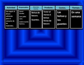 El documento describe un proyecto de recolección de basura realizado por 3 personas. El proyecto involucra la recolección de por lo menos 5 bolsas llenas de basura usando bolsas y guantes en el transcurso de una semana.