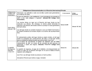 Este documento resume las diferentes obligaciones extracontractuales en el derecho internacional privado según el Código Civil Venezolano y el Código Bustamante. Explica que los hechos ilícitos se rigen por la ley del lugar donde se produjeron los efectos, pero la víctima puede solicitar la ley del lugar donde se originó la causa. La gestión de negocios ajenos y el pago de lo indebido se rigen por la ley del lugar donde se realizó el hecho originario de la obligación. El enriquecimiento sin causa y