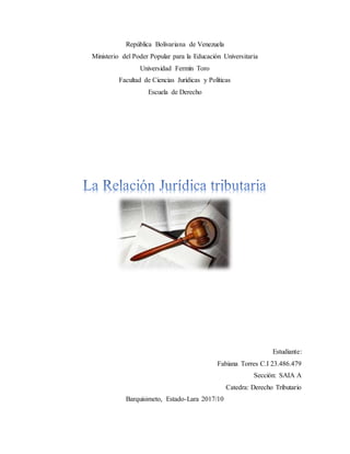 La relación jurídica tributaria es una obligación del contribuyente de pagar impuestos basada en el poder de imposición del Estado. Tiene tres elementos esenciales: el sujeto activo (el Estado), el hecho imponible (la situación que genera la obligación de pagar), y el deudor tributario (la persona u organización obligada a pagar). El documento también describe los diferentes tipos de domicilio reconocidos por el Código Orgánico Tributario venezolano y las referencias bibliográficas utilizadas.