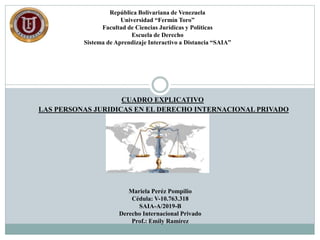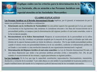 El documento explica los criterios para determinar la Lex Societatis de las personas jurídicas, en particular las sociedades mercantiles. Discute cuatro criterios clave: 1) reconocimiento, 2) nacionalidad, 3) capacidad, y 4) domicilio. También resume las soluciones contenidas en la Ley Venezolana de Derecho Internacional Privado, incluyendo el Código Civil, Código de Comercio y contratación internacional.