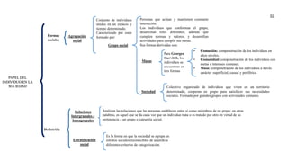 El documento resume conceptos clave sobre la sociedad y el individuo. Explica que una sociedad está compuesta por grupos sociales formados por individuos que interactúan y comparten normas y valores. Los individuos pueden encontrarse en tres formas según Gurvitch: comunión, comunidad o masa. Una sociedad es un colectivo organizado de individuos que viven en un territorio determinado y cooperan para satisfacer sus necesidades sociales a través de grandes grupos con actividades comunes. El documento también analiza las relaciones intergrupales e intragrupales y la estrat