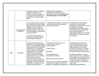 Este documento discute varios problemas ambientales como la erosión del suelo, la deforestación, el agujero de ozono y la extinción de especies. La erosión del suelo conduce a la infertilidad y la falta de filtración de agua, mientras que la deforestación contribuye significativamente a las emisiones de gases de efecto invernadero y pone en riesgo ecosistemas y comunidades. El agujero de ozono sobre la Antártida está vinculado al cambio climático y puede causar cáncer y daños a la visión