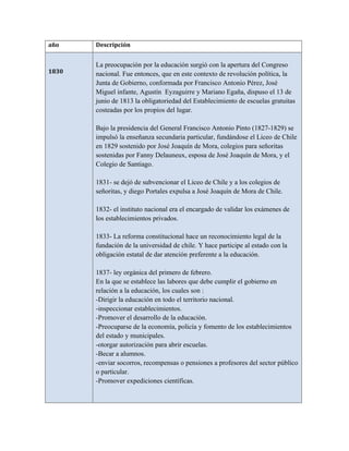 Este documento resume las principales reformas educacionales en Chile entre 1830 y 2012. Algunas de las reformas más importantes incluyen la creación de la educación primaria gratuita en 1860, la expansión de la educación secundaria en 1879, la educación primaria obligatoria en 1920, y la reforma educacional de 1965 durante el gobierno de Frei Montalva que extendió la educación obligatoria a 8 años. El documento también describe los cambios realizados durante la dictadura militar entre 1973-1990 que descentralizaron el sistema educativo y aumentaron la participación priv