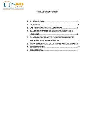 Este documento describe las herramientas telemáticas, incluyendo las sincrónicas y asincrónicas. Presenta un cuadro sinóptico de las herramientas de e-learning y un cuadro comparativo de las herramientas sincrónicas y asincrónicas. También incluye un mapa conceptual del campus virtual de la UNAD y concluye resaltando la importancia de las herramientas telemáticas.
