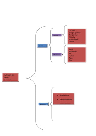 Los factores del medio ambiente se clasifican en abióticos como la luz solar, temperatura y suelo, y bióticos como productores, consumidores y descomponedores. Los factores abióticos se subdividen en físicos relacionados con el clima y químicos como la composición del suelo. Los bióticos son los organismos vivos que interactúan en un ecosistema.