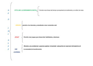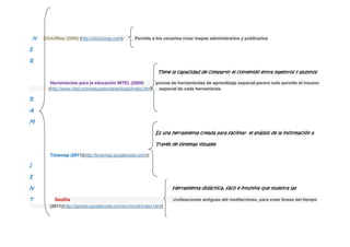 El documento describe varias herramientas digitales para la educación como Click2Map, que permite crear y publicar mapas; GeoDia, una herramienta didáctica para mostrar líneas de tiempo de civilizaciones antiguas; y OTTO LINE, que permite crear líneas de tiempo con multimedia y notas. También menciona herramientas como ARDORA y JCLIC para crear contenido web y juegos educativos.
