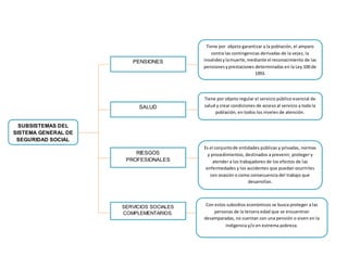 El documento describe los subsistemas del sistema general de seguridad social en Colombia: salud, riesgos profesionales, pensiones y servicios sociales complementarios. El sistema de salud tiene como objetivo regular el servicio público esencial de salud y crear condiciones de acceso para toda la población. El sistema de pensiones busca garantizar protección contra la vejez, invalidez y muerte mediante el reconocimiento de pensiones y prestaciones determinadas por la ley. El subsistema de riesgos profesionales previene, protege y atiende a
