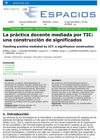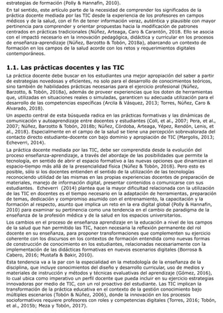 Este estudio etnometodológico examinó los significados de las prácticas docentes mediadas por TIC en campos médicos y de enfermería a través de entrevistas, observación y grupos de discusión. Los resultados mostraron que si bien las TIC son vistas como un complemento útil, los docentes no están muy familiarizados con su uso en la enseñanza. Además, la mediación tecnológica se percibe como un desafío para adaptar los estilos docentes a este nuevo contexto.