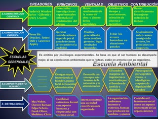 Este documento presenta un resumen de varias escuelas y teorías gerenciales, incluyendo sus creadores, principios, objetivos y contribuciones. Describe la administración científica, empírica, de comportamiento humano, sistema social, de sistemas, teoría de decisiones, neo-humano relacionismo y eclectica universal. Además, menciona brevemente las teorías X, Z y Y de McGregor sobre estilos de liderazgo y gestión de recursos humanos.