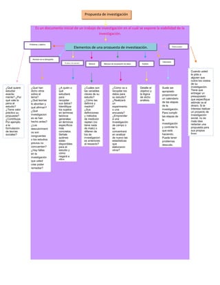 Este documento presenta los elementos clave de una propuesta de investigación, incluyendo la declaración del problema de investigación, una revisión de la literatura existente, la descripción de los sujetos y métodos de estudio, el plan de recopilación y análisis de datos, y un calendario y presupuesto propuestos. La propuesta busca establecer la viabilidad y valor del estudio propuesto.