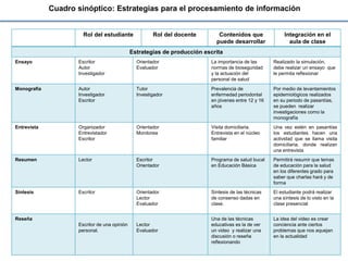 El documento presenta una tabla con diferentes estrategias de aprendizaje que pueden utilizarse en el aula, describiendo los roles del estudiante y el docente, así como los contenidos que se pueden desarrollar utilizando cada estrategia. La tabla incluye estrategias de participación, producción escrita, y representación gráfica que permiten integrar diferentes temas de salud en el aula de manera participativa y práctica.