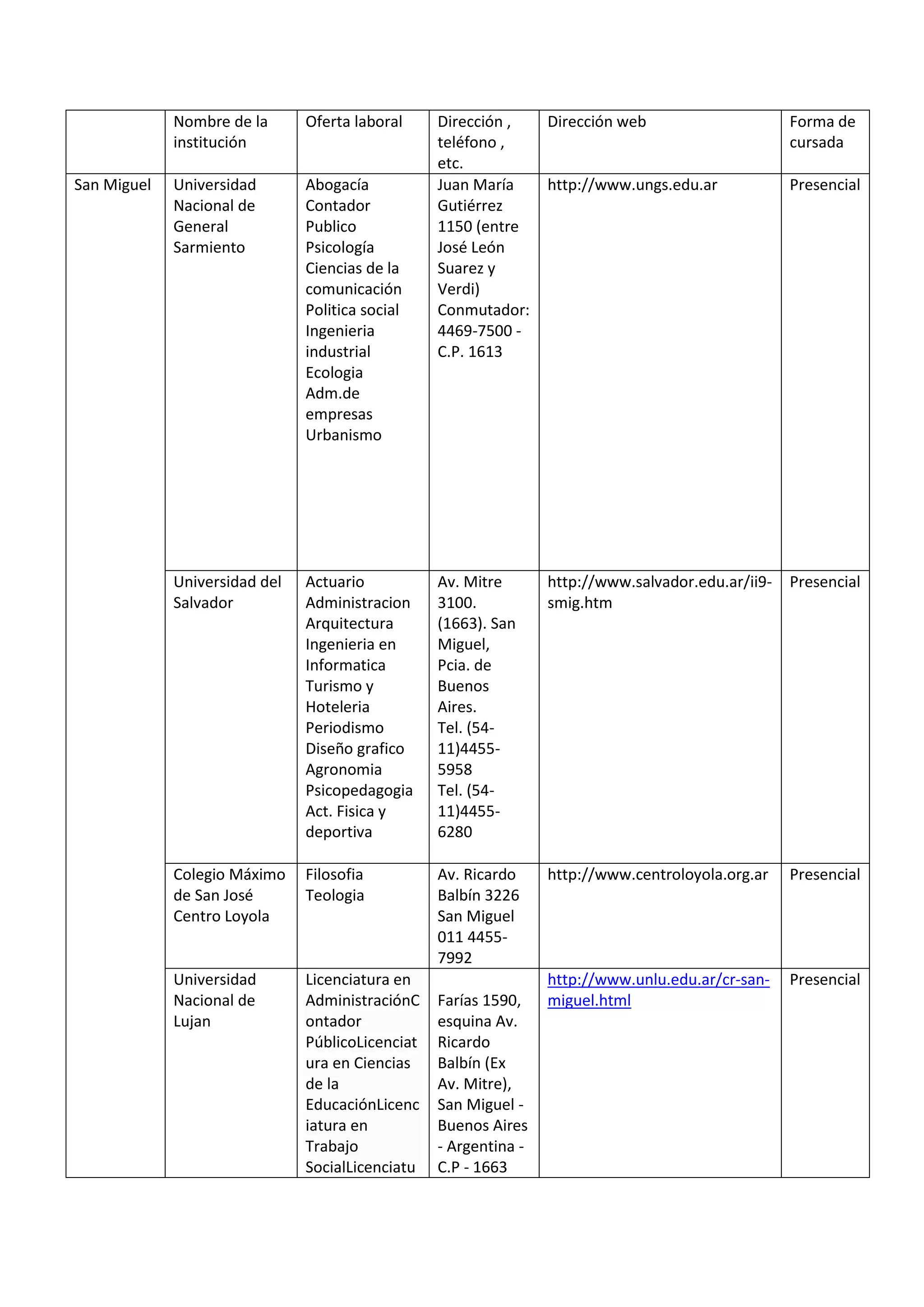 Este documento lista varias universidades, colegios e instituciones educativas de la zona de San Miguel y alrededores en Buenos Aires, Argentina. Proporciona información sobre las carreras y programas disponibles, direcciones, números de teléfono y sitios web de cada institución educativa.
