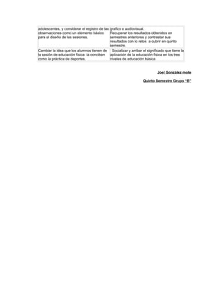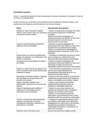 El documento aborda retos y aportaciones en la enseñanza de educación física en niveles de preescolar, primaria y secundaria. Se destaca la importancia de la interacción maestro-alumno, la observación de prácticas pedagógicas y la necesidad de diversificar estrategias didácticas para mejorar la experiencia de aprendizaje. También se mencionan las habilidades necesarias para adaptarse a situaciones imprevistas y la importancia de observar a los estudiantes para mejorar el diseño de las sesiones.