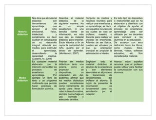 El documento aborda el concepto y la definición de recursos didácticos, explicando su importancia en el proceso de enseñanza-aprendizaje y cómo estos medios materiales, tanto físicos como virtuales, facilitan la instrucción. Se destacan las diferencias y similitudes entre recursos didácticos, medios didácticos y objetos de aprendizaje, enfatizando su rol en la educación integral de los estudiantes. Se incluyen referencias a diversas fuentes que apoyan estas definiciones y conceptos en el ámbito educativo.