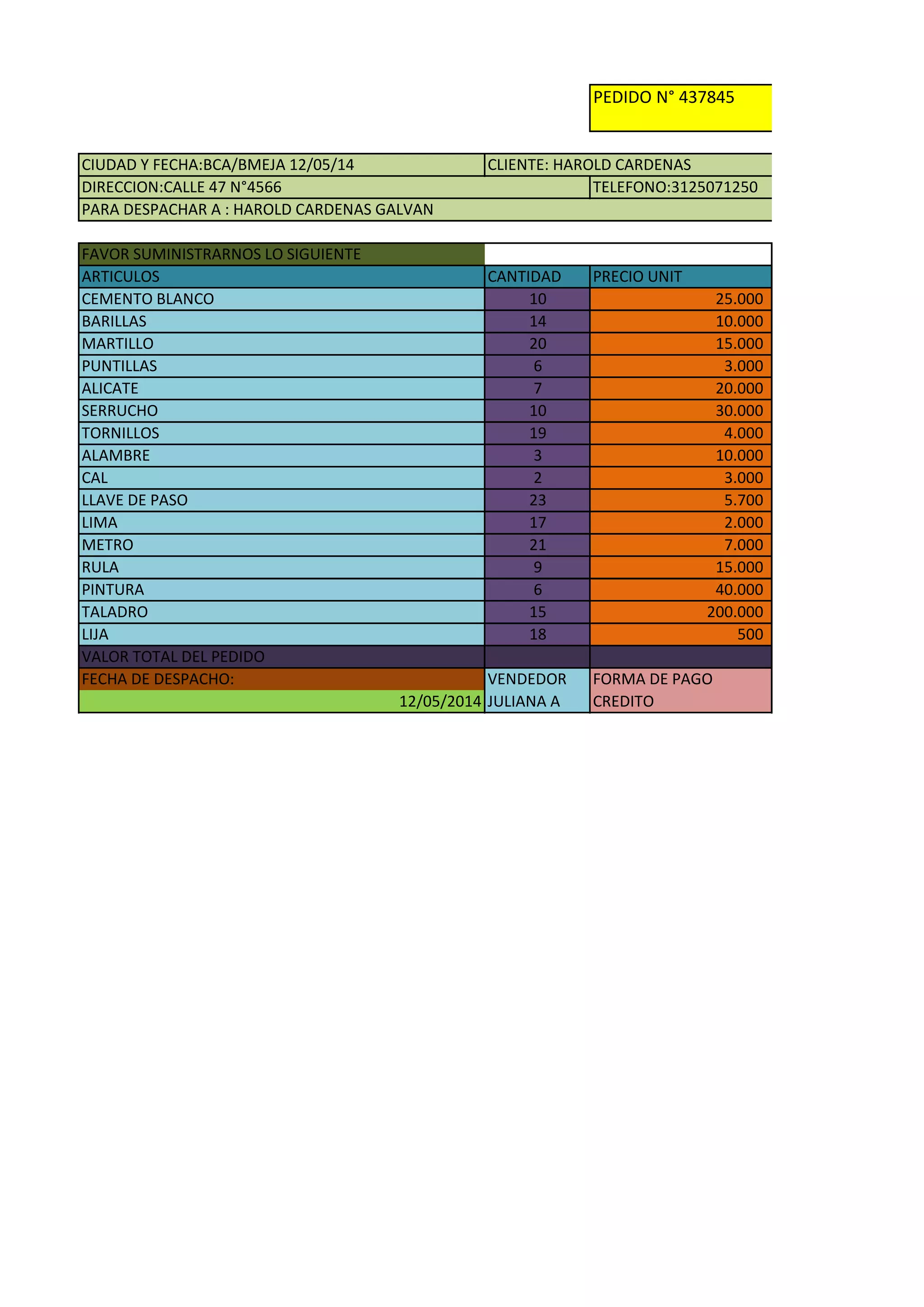 El pedido número 437845 realizado por Harold Cárdenas en BCA/BMEJA el 12/05/14 incluye una variedad de artículos de construcción como cemento, martillos, pintura y taladros por un valor total de $4.696.100, con fecha de despacho del 12/05/14 y forma de pago a crédito.