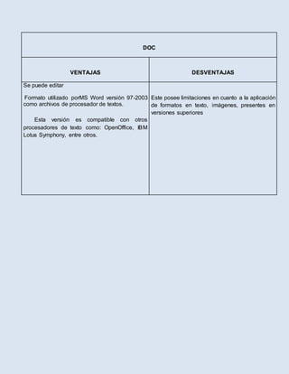 Este documento compara diferentes formatos de archivos digitales, incluyendo formatos de texto (como DOC, DOCX, TXT), formatos de imágenes (como JPG, PNG, GIF), formatos de sonido (como MP3, WMA), y formatos de video (como FLV, AVI, 3GP). Para cada formato, se enumeran sus ventajas y desventajas con respecto a la edición, compatibilidad, tamaño y calidad.
