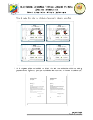 El documento explica cómo crear y usar cuadros de texto en Microsoft Word. Describe las 5 pasos para insertar un cuadro de texto, incluyendo seleccionar una ubicación, crear el cuadro, agregar texto, ajustar el tamaño y posicionar el cuadro. También menciona que los cuadros de texto son útiles para enmarcar texto, crear plantillas y explicar relaciones, pero demasiados pueden hacer que un documento se vea desordenado. Finalmente, propone una actividad práctica de crear una boleta de ri