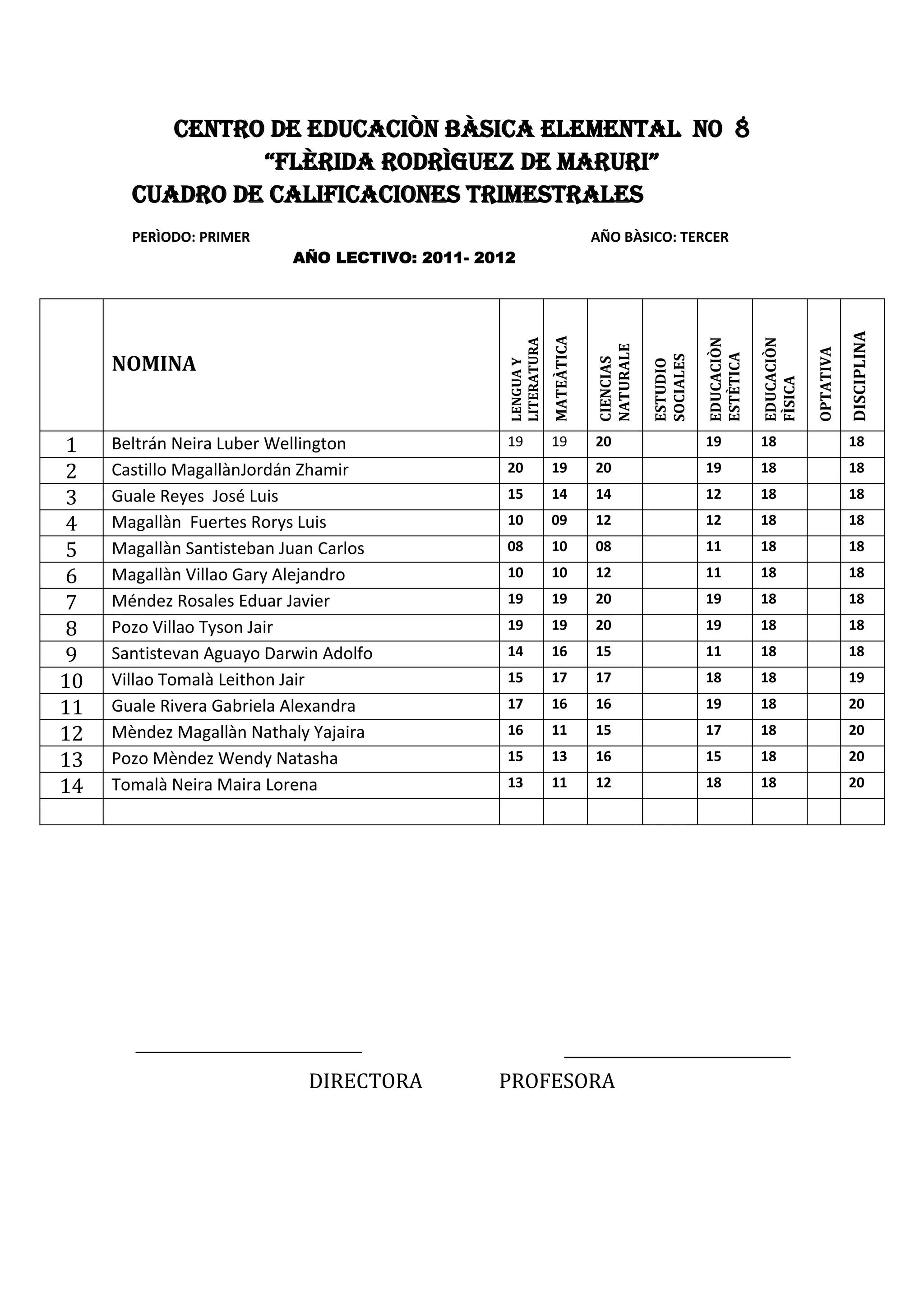 Este documento presenta los cuadros de calificaciones trimestrales de los estudiantes del tercer año básico del Centro de Educación Básica Elemental N° 8 "Flérida Rodríguez de Maruri" para los periodos primero, segundo y tercero del año lectivo 2011-2012. Las calificaciones de cada estudiante se presentan en las diferentes asignaturas como matemáticas, lengua y literatura, ciencias naturales, entre otras.