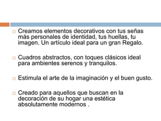 Este documento describe una empresa que crea cuadros modernos y abstractos de forma artesanal. Ofrece sus productos en varios países de América Latina y planea expandir su línea de diseños. Sus cuadros se elaboran a mano con pintura acrílica en lienzo o madera, y tienen precios entre $700-$800 dependiendo de los materiales y estilo. La empresa distribuye sus productos a través de minoristas y planea promociones como obsequios y descuentos.