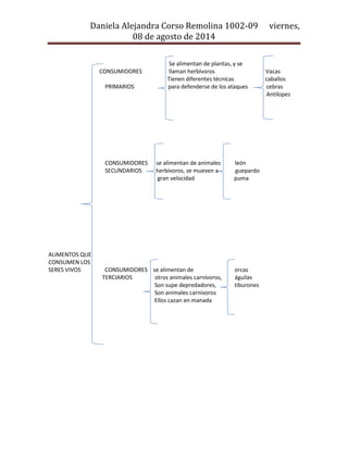 Los consumidores primarios como las vacas y los antílopes se alimentan de plantas. Los consumidores secundarios como el león y el guepardo se alimentan de los consumidores primarios. Los consumidores terciarios como las orcas y las águilas se alimentan de otros animales carnívoros. Tanto los consumidores secundarios como los terciarios son carnívoros.