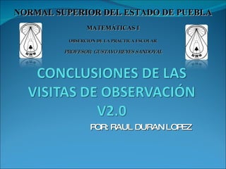 El documento describe los temas de una observación de práctica escolar en matemáticas I para la Normal Superior del Estado de Puebla. Los temas incluyen la influencia del medio social, los intereses, actitudes y expectativas de los alumnos frente a su escuela, y las formas de trabajo más frecuentes en el aula.