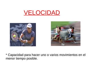 El documento describe las cualidades físicas básicas del organismo humano, incluyendo velocidad, fuerza, flexibilidad y resistencia. La velocidad se define como la capacidad para realizar movimientos en el menor tiempo posible, mientras que la fuerza es la capacidad para vencer o equilibrar una resistencia. La flexibilidad implica la movilidad articular y elasticidad muscular, y la resistencia es la capacidad de mantener un esfuerzo físico de forma continuada.