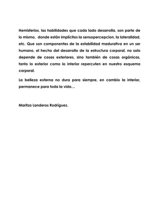 El desarrollo del esquema corporal comienza en la primera infancia cuando los niños comienzan a moverse y experimentar sensaciones a través de sus cuerpos. A medida que los niños crecen y ganan más experiencias, aprenden más sobre sus cuerpos. El esquema corporal se forma a lo largo de la vida y refleja quiénes somos, influenciado tanto por factores externos como internos.
