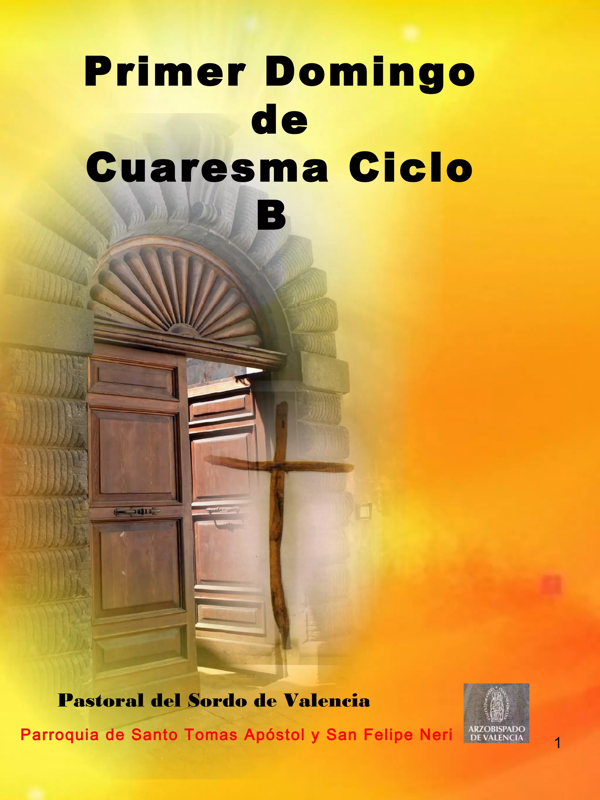 El documento presenta las lecturas para el primer domingo de Cuaresma. La lectura del Génesis habla sobre la alianza entre Dios y Noé después del diluvio, usando el arco iris como señal. La carta de Pedro compara la salvación en el arca con el bautismo. El Evangelio según Marcos describe como el Espíritu lleva a Jesús al desierto para ser tentado, y luego predica sobre el Reino de Dios.