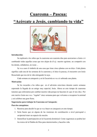 Este documento ofrece sugerencias para trabajar la Cuaresma con niños en catequesis. Propone usar un símbolo de una casa de cinco plantas donde cada semana se sube un piso para acercarse a Jesús. Cada piso tendrá una palabra del Evangelio. También incluye actividades como oración, ayuno y limosna. El objetivo es que los niños obtengan cinco llaves con palabras para abrir la puerta del ático y celebrar la Pascua.